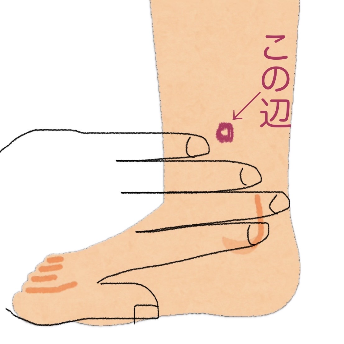 見つけ方はとっても簡単! 内くるぶしのポコッとした骨の一番高いところに、自分の指を4本(人差し指から小指まで)ピタッと置きます。 その小指が当たっている、スネの骨のキワにある凹みが「三陰交」です!