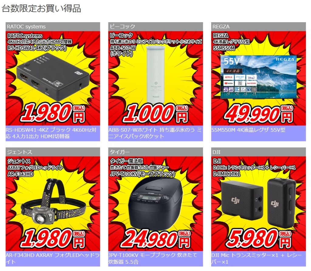 例えば、VANKYOのAndroidタブレット(3GB/64GB/WiFi対応)が12,980円(税込)、LGの4K有機ELテレビ(48型)が116,809円(税込)、セイコーのお洒落な白塗装 ミッキー&ミニーの電波掛け時計が15,849円(税込)で売られていました。